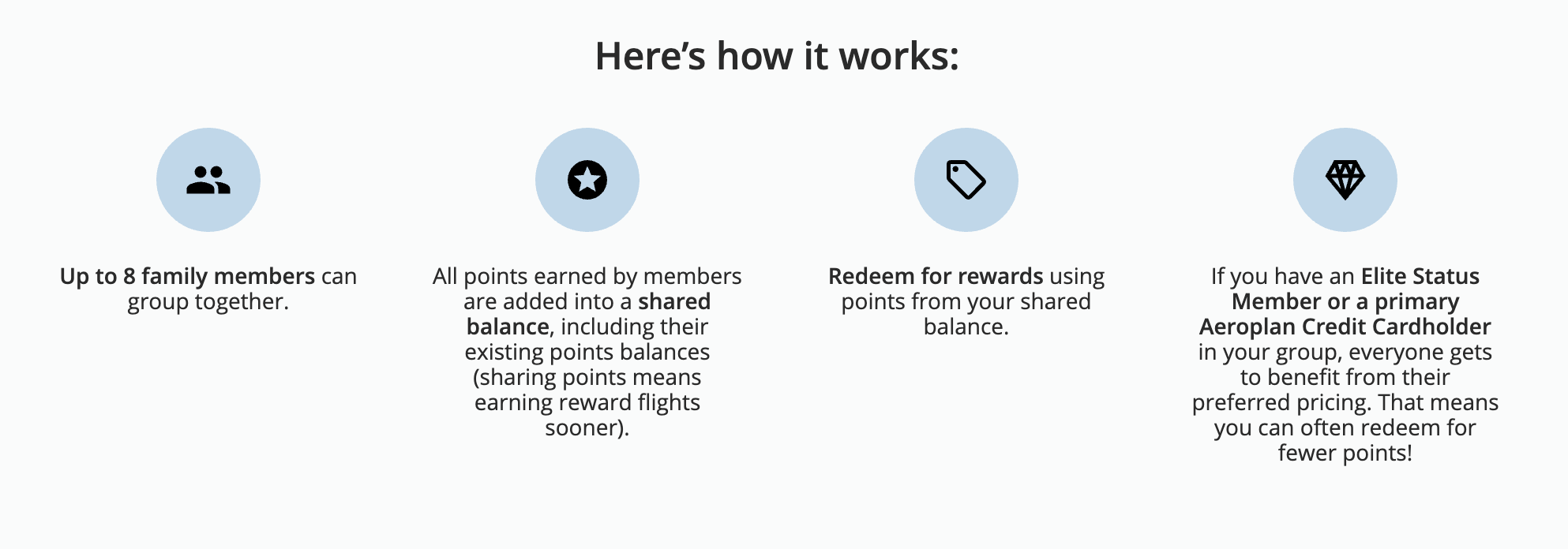 Family Sharing groups also allow for the sharing of certain benefits: for example, if one member of the Family has Aeroplan Elite Status or holds a co-branded credit card, thereby benefiting from preferred pricing on Air Canada flights as part of the dynamic pricing model, then everyone else in the Family will benefit from preferred pricing as well.
