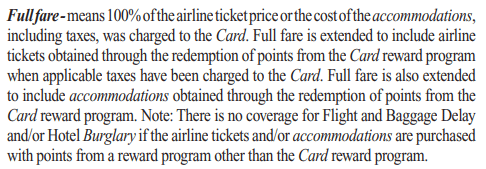 To be eligible for coverage for flight delays, baggage delays, trip cancellation & interruption, or travel accident insurance, you’ll most likely need to have booked the trip and paid at least 75% of the portion with the credit card. This can be an issue for anyone who primarily travels on award tickets, as a flight that’s paid for with miles can’t really be charged “in full” to any card at all.