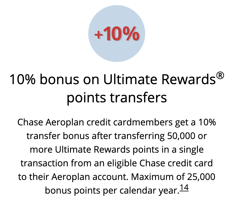 If you also hold the Chase Aeroplan® Credit Card, you’ll earn an additional 10% transfer bonus as long as a minimum of 50,000 Ultimate Rewards points are transferred, resulting in an effective ratio of 1:1.35.