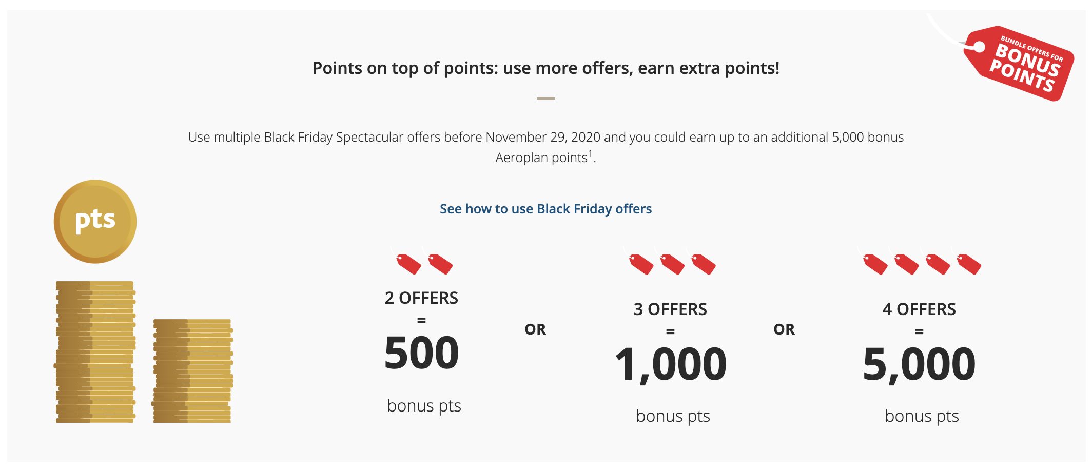 Speaking of stacking, you’ll be able to earn up to 5,000 bonus Aeroplan points simply by taking advantage of multiple Black Friday offers.