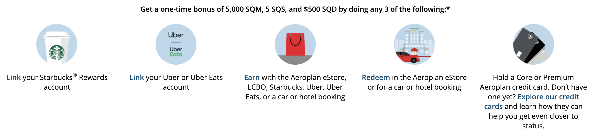 For example, I’ve already linked my Starbucks and Uber accounts, and currently hold a premium Aeroplan credit card. I don’t need to take any further action to satisfy three of the five criteria by April 30, and I’ll automatically get my bonus SQM, SQS, and SQD.