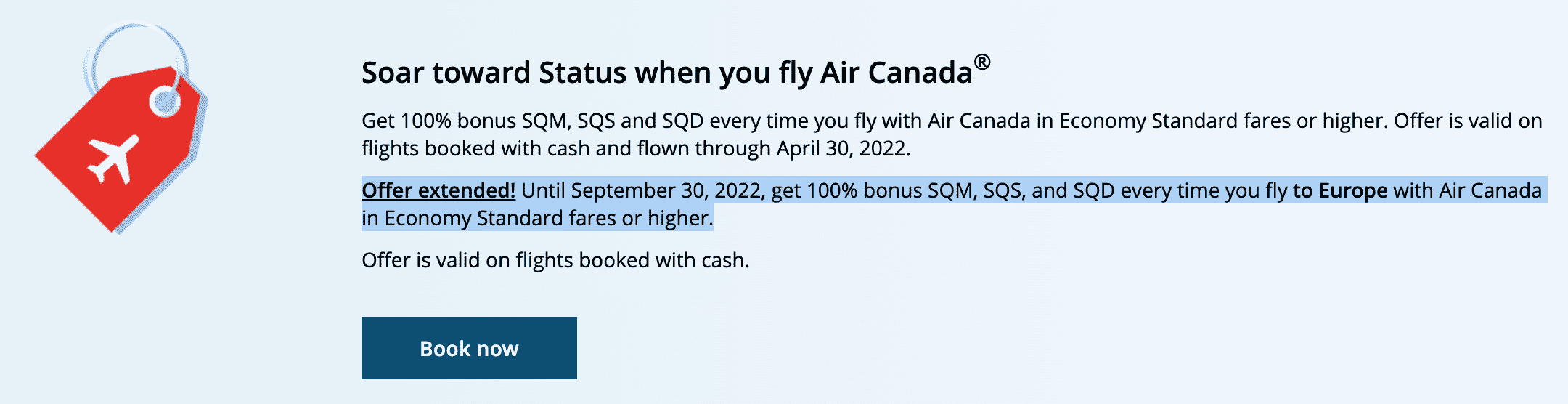 Then, from May 1 through September 30, members will continue to earn 100% bonus SQM, SQS, and SQD on their paid flying activity with Air Canada on Economy Standard fares or higher – to European destinations only.