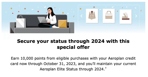 By earning at least 10,000 Aeroplan points on an eligible Aeroplan co-branded credit card between September 1 and October 31, 2023, you can extend your 2023 status through to the end of 2024.