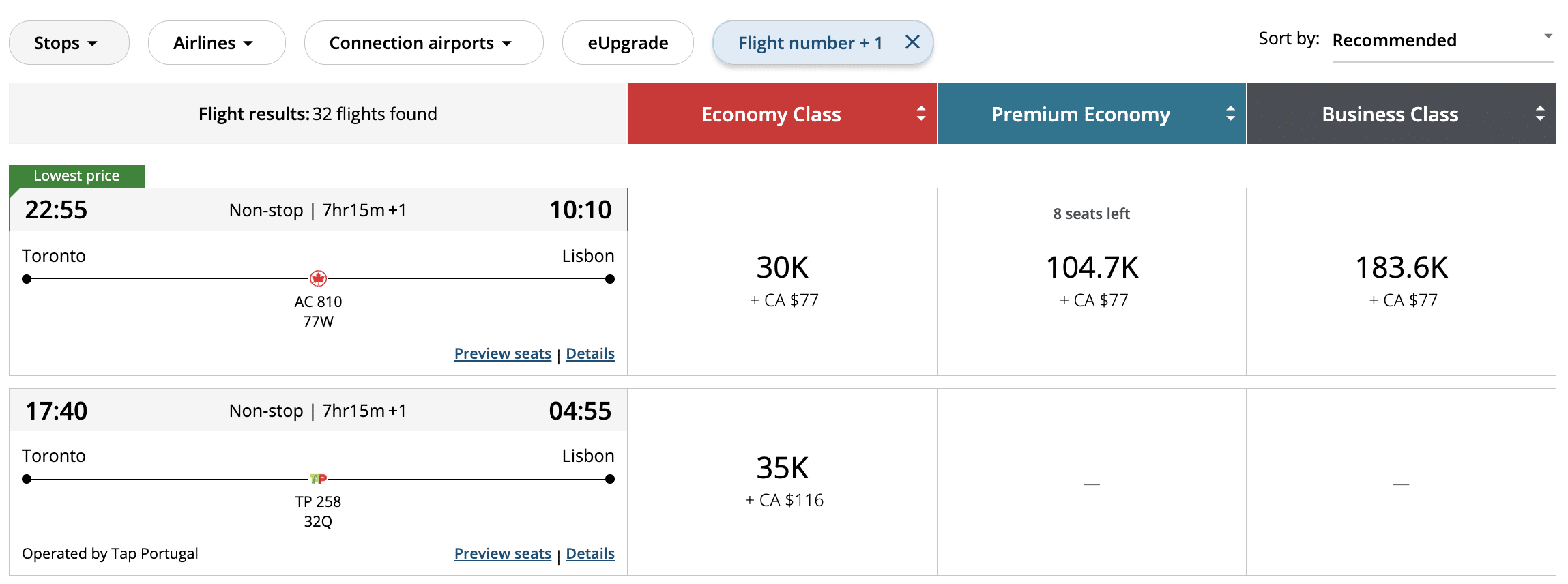 Normally, partner flights from Toronto to Lisbon require a fixed 35,000 Aeroplan points in economy class. However, with this promotion, you may find Air Canada flights priced lower than partner airlines, allowing you to save points while also paying lower taxes and fees.