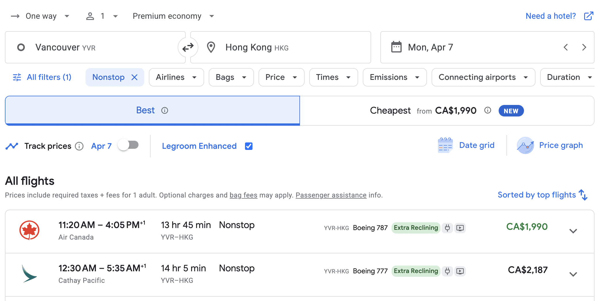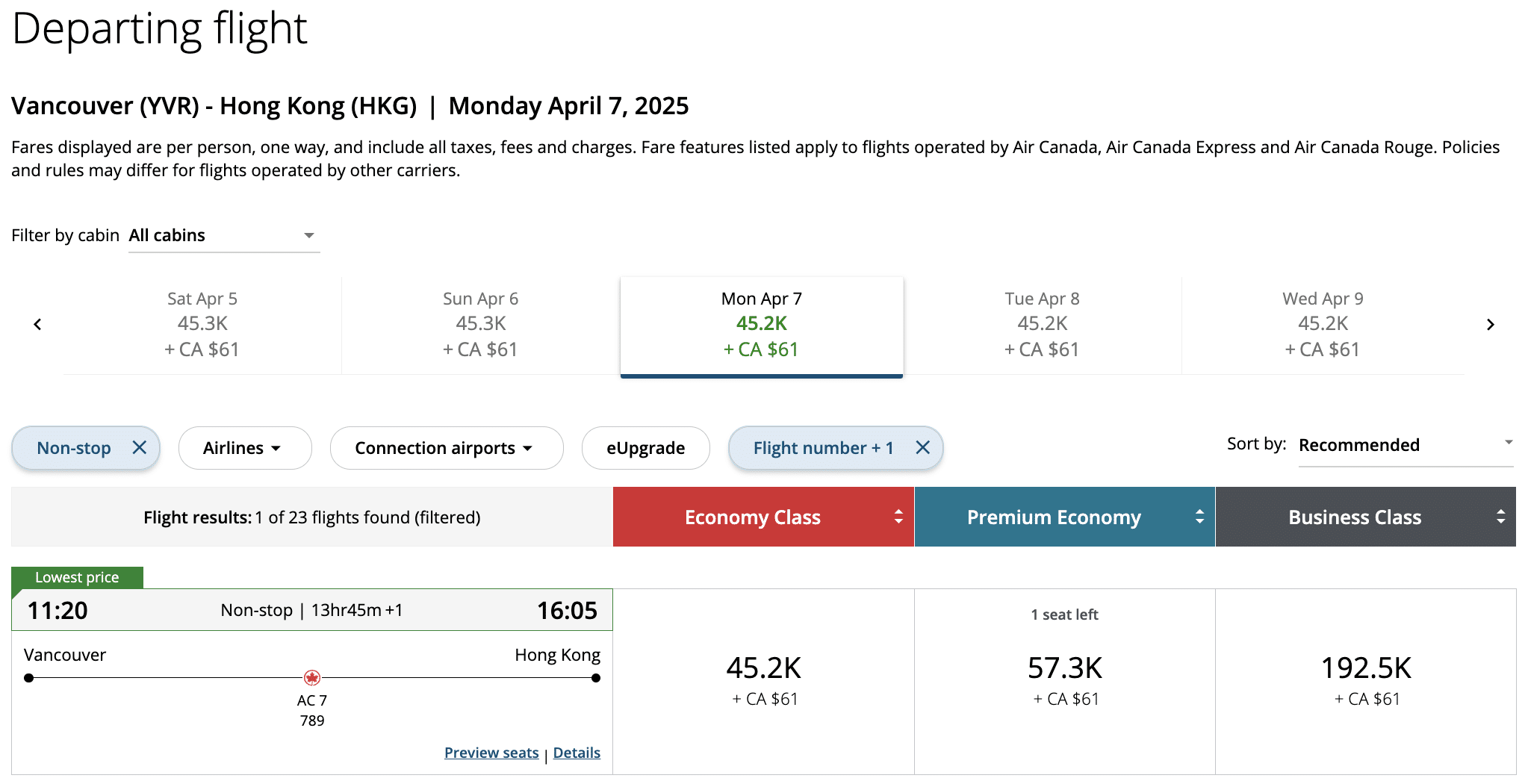 For example, a one-way flight from Vancouver (YVR) to Hong Kong (HKG) in premium economy is available for 57,300 Aeroplan points plus CA$61 in taxes and fees.