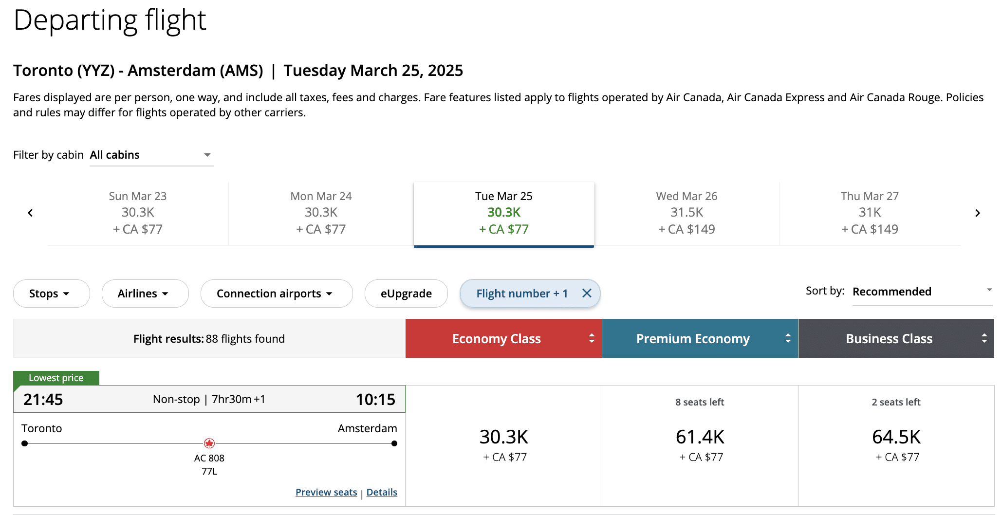 Toronto (YYZ) to Amsterdam (AMS) for 64,500 Aeroplan points in Business Class