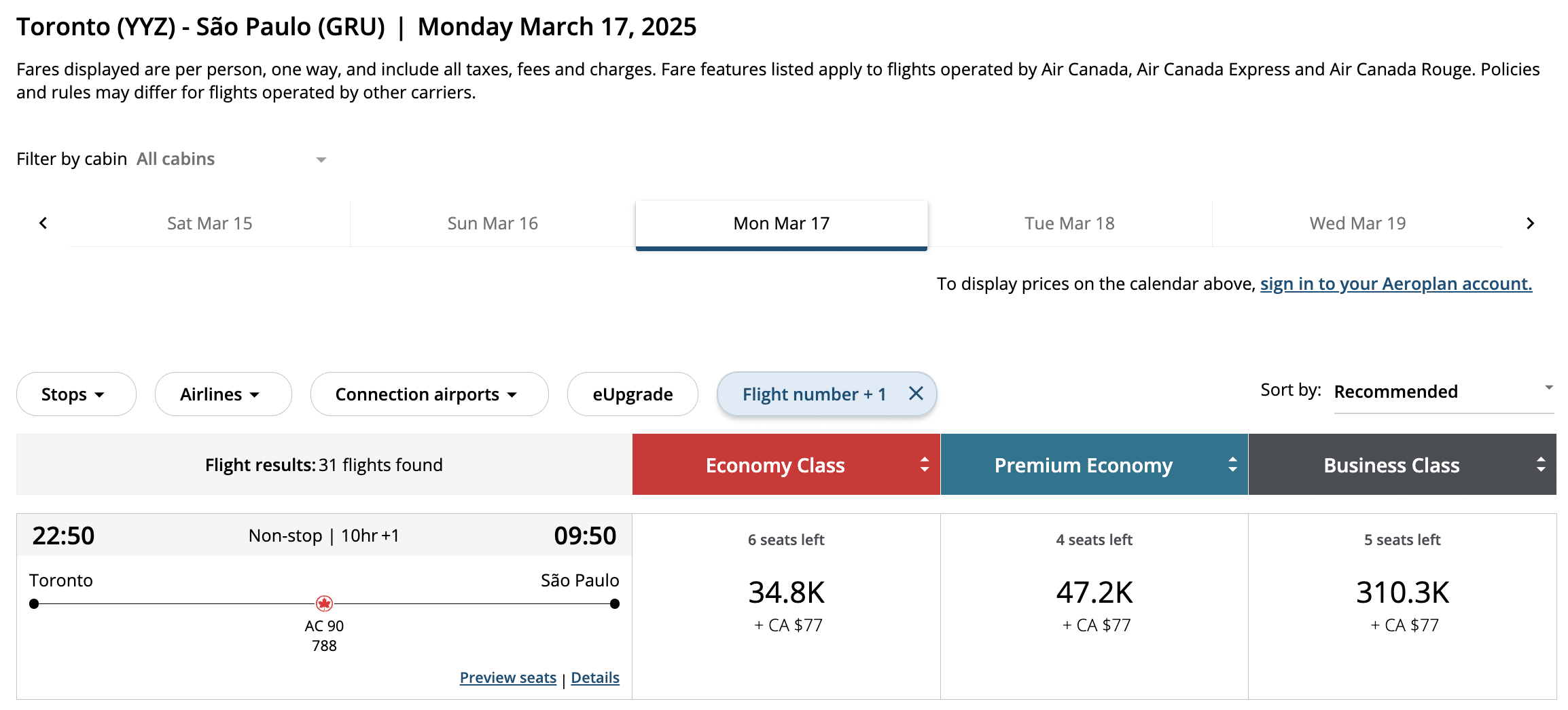 Toronto (YYZ) to São Paulo (GRU) for 34,800 Aeroplan points in economy class
