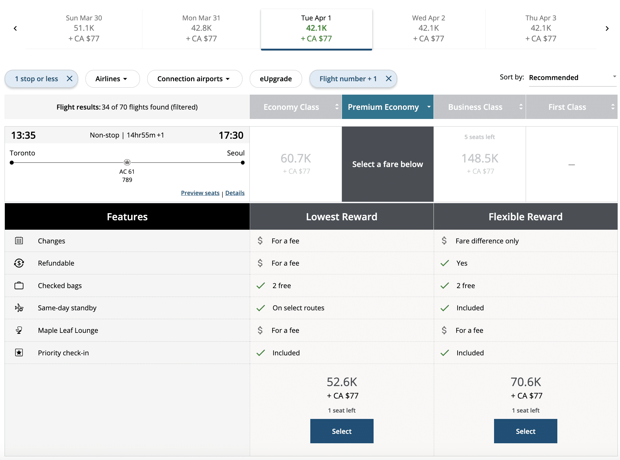 If you have eUpgrade credits, you can enhance this deal by using the “Latitude Attitude” strategy to upgrade instantly to business class. For instance, the Toronto (YYZ) to Seoul (ICN) flight can be upgraded to business class for 70,600 Aeroplan points and CA$77 in taxes and fees.