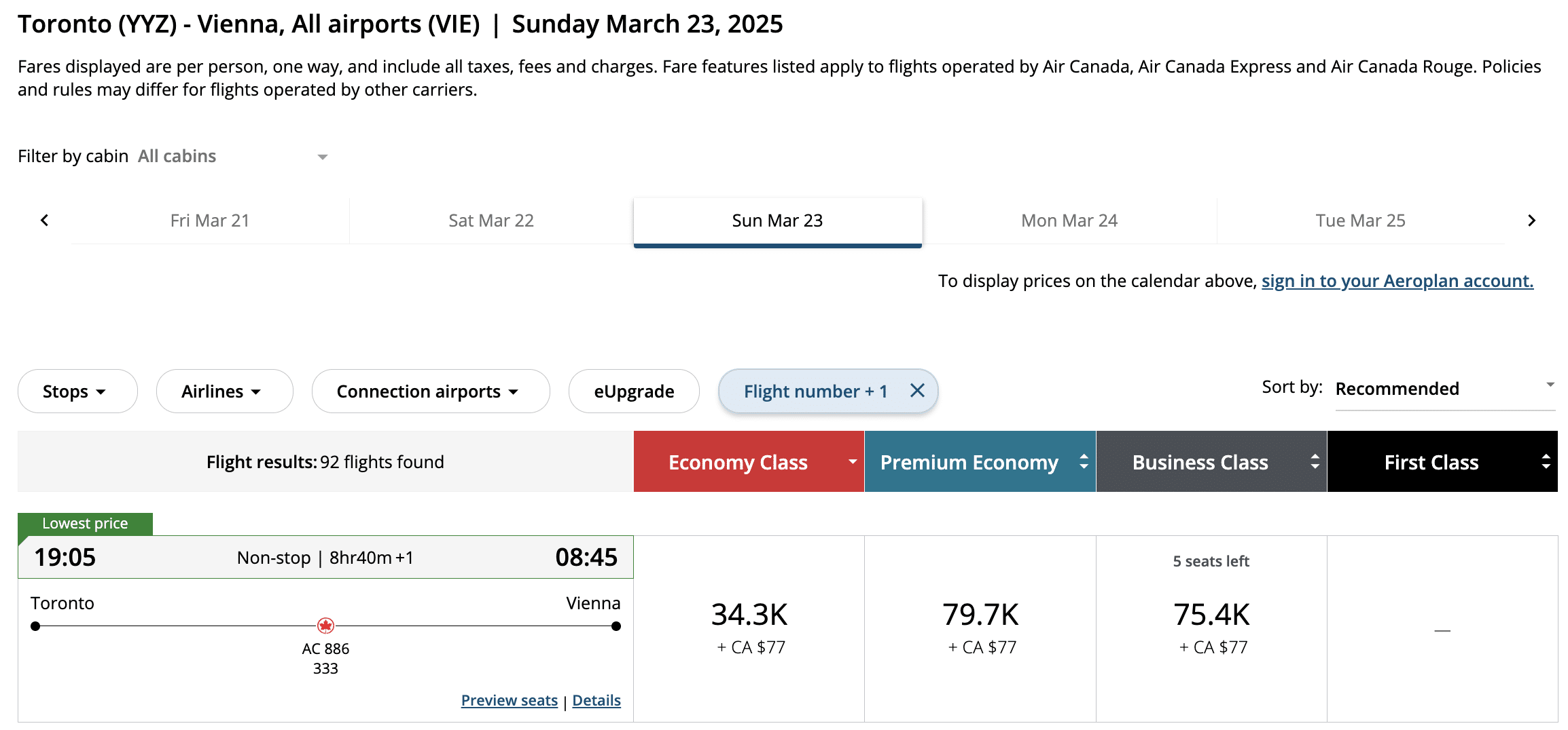 Toronto (YYZ) to Vienna (VIE) for 75,400 Aeroplan points in business class