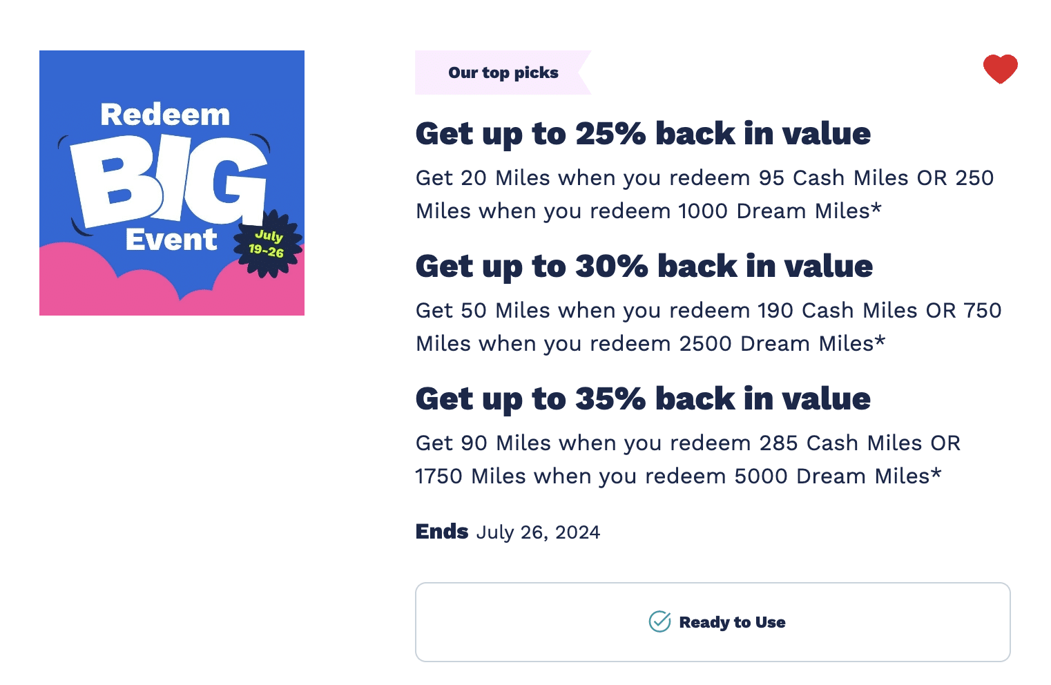 This means you may only receive one offer tier each for Cash Miles and Dream Miles redemptions, and you won’t receive more than one bonus even if you redeem multiple times.