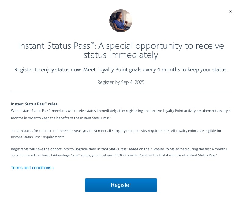 Upon registering, you’ll receive instant AAdvantage status for four months—typically Platinum Pro for Globalist, Platinum for Explorist and Gold® for Discoverist members.