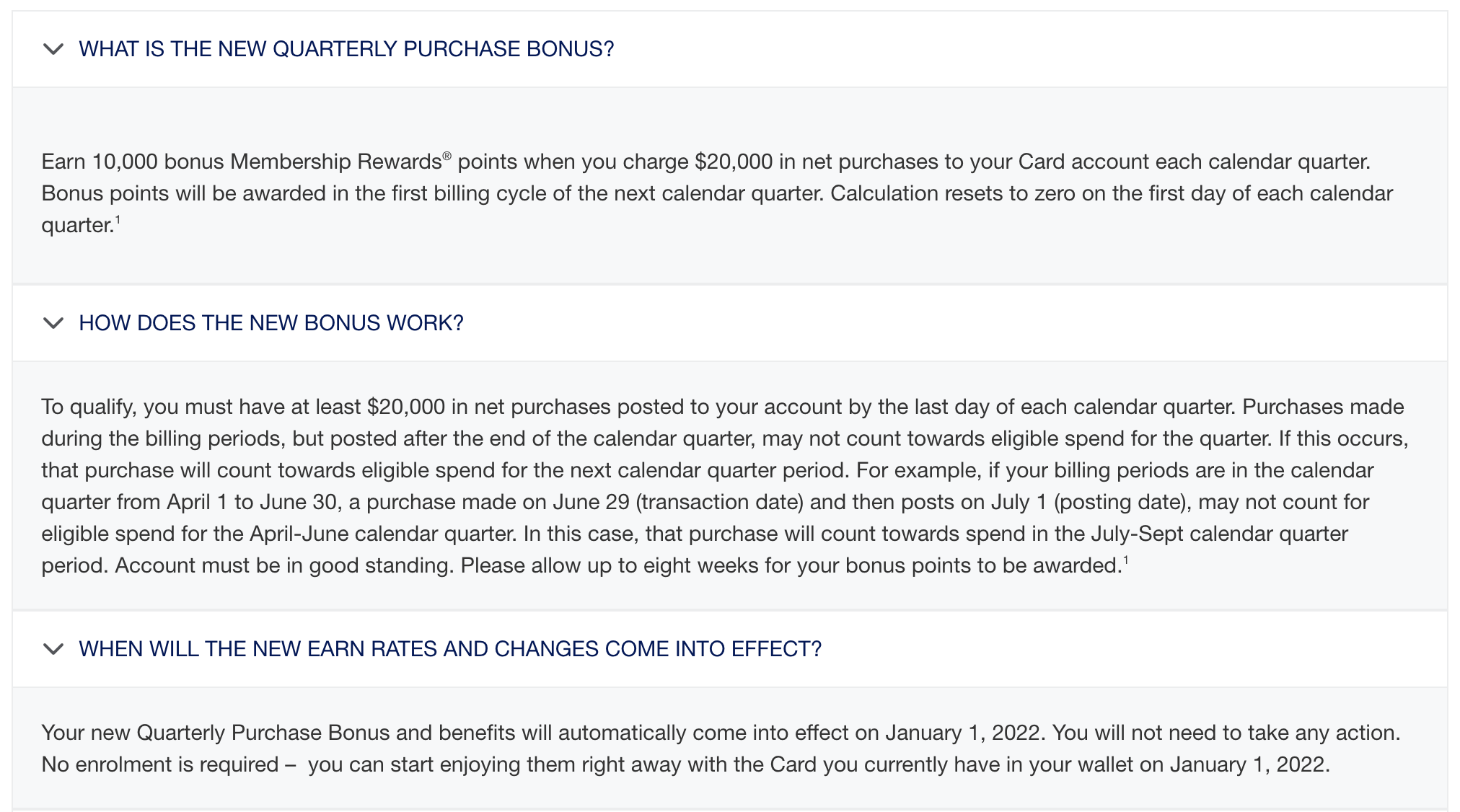The Quarterly Purchase Bonus benefit kicks in on January 1, 2022. No enrollment or registration is required – all of your purchases in 2022 will simply start counting towards the quarterly bonus.