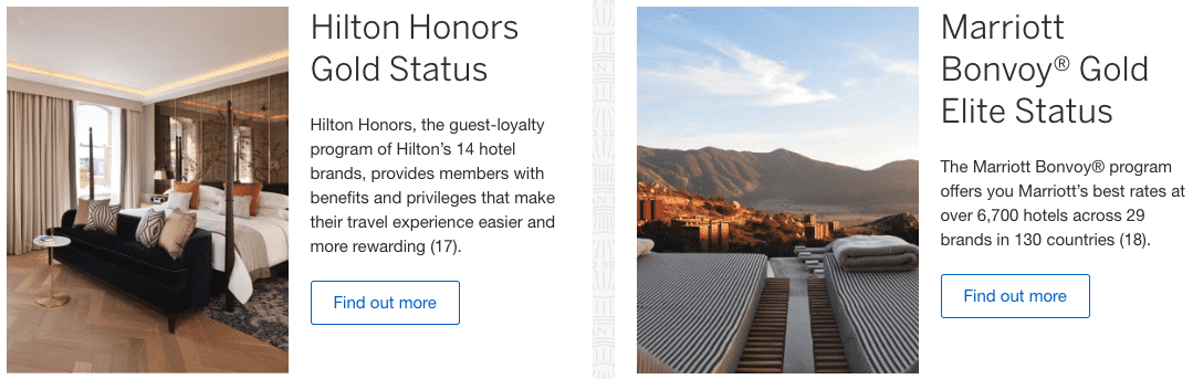 You’ll also get unlimited airport lounge access to Priority Pass, Plaza Premium, Delta Sky Club, and Centurion lounges. Furthermore, the Platinum Card confers instant elite status levels (upon enrolment) in Marriott Bonvoy (Gold Elite) and Hilton Honors (Gold Elite).