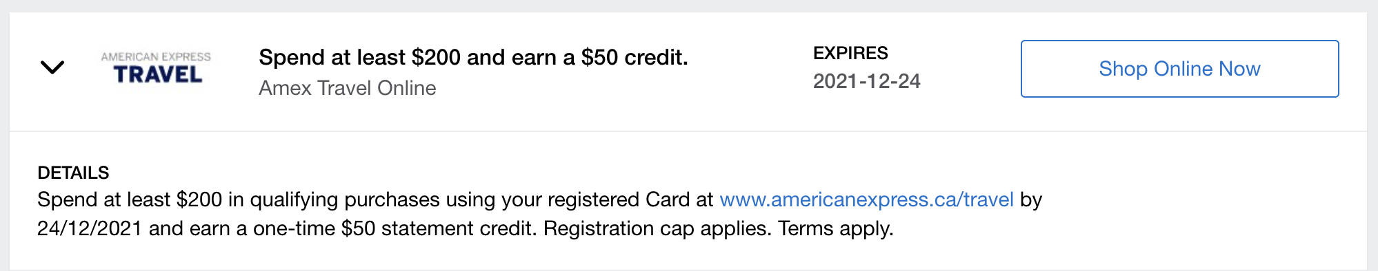 The second offer is for a $50 statement credit upon making a $200 purchase via Amex Travel Online.