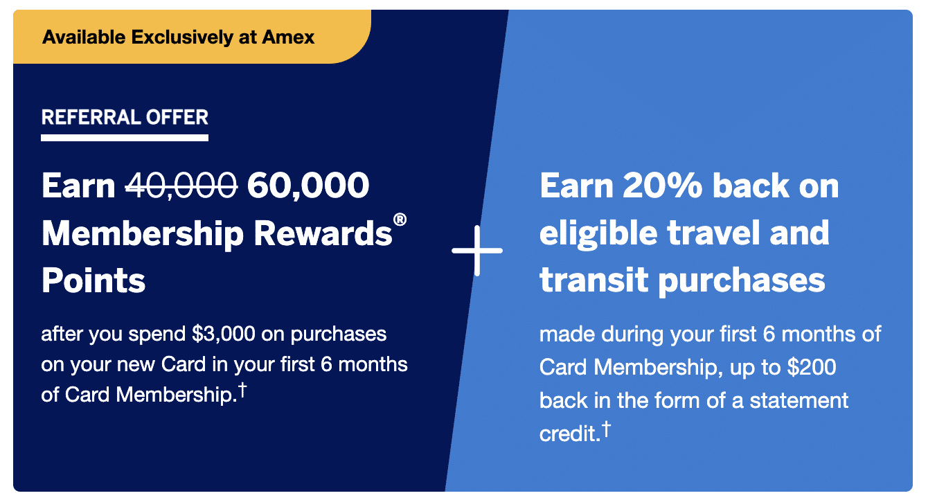 - Earn 60,000 Amex US Membership Rewards points upon spending $3,000 (USD) in the first six months