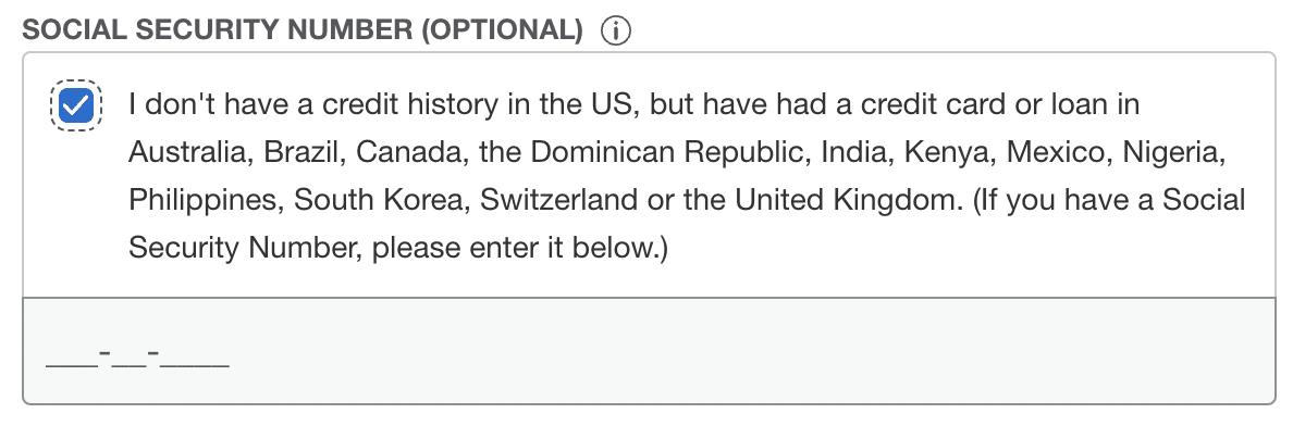 If not, you can quite easily apply for this card via the Nova Credit service. When filling in the application, simply check the box that says “I don’t have a credit history in the US, but have had a credit card or loan in Australia, Brazil, Canada, the Dominican Republic, India, Kenya, Mexico, Nigeria, Philippines, South Korea, Switzerland, or the United Kingdom” on the application form, where it asks you for a Social Security Number.