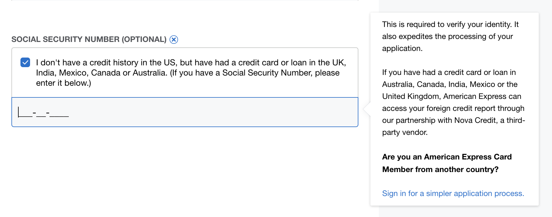 If not, you can quite easily apply for this card via the Nova Credit service, simply by checking the box that says “I don’t have a credit history in the US, but have had a credit card or loan in the UK, India, Mexico, Canada or Australia” on the application form, where it asks you for a Social Security Number.
