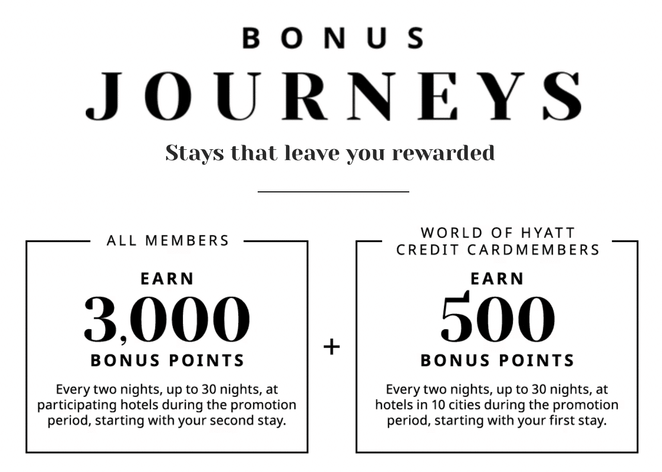 With the “Bonus Journeys” promotion, you’ll earn 3,000 World of Hyatt points for every two nights stayed, and award nights are also eligible for earning the extra points. You can also earn 500 bonus points if you have an eligible World of Hyatt credit card and stay for two nights in select cities.
