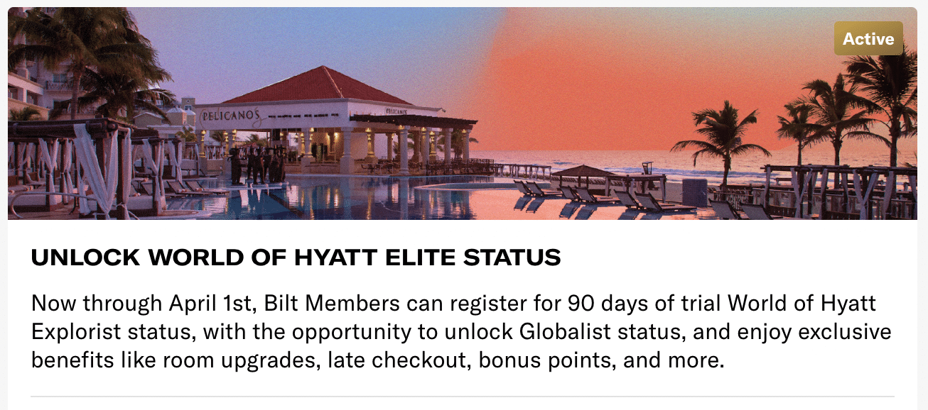 From March 28 to April 1, 2023, you can sign up for a 90-day trial of World of Hyatt Explorist status as part of the Bilt Rewards Rent Day promotion for April 2023.