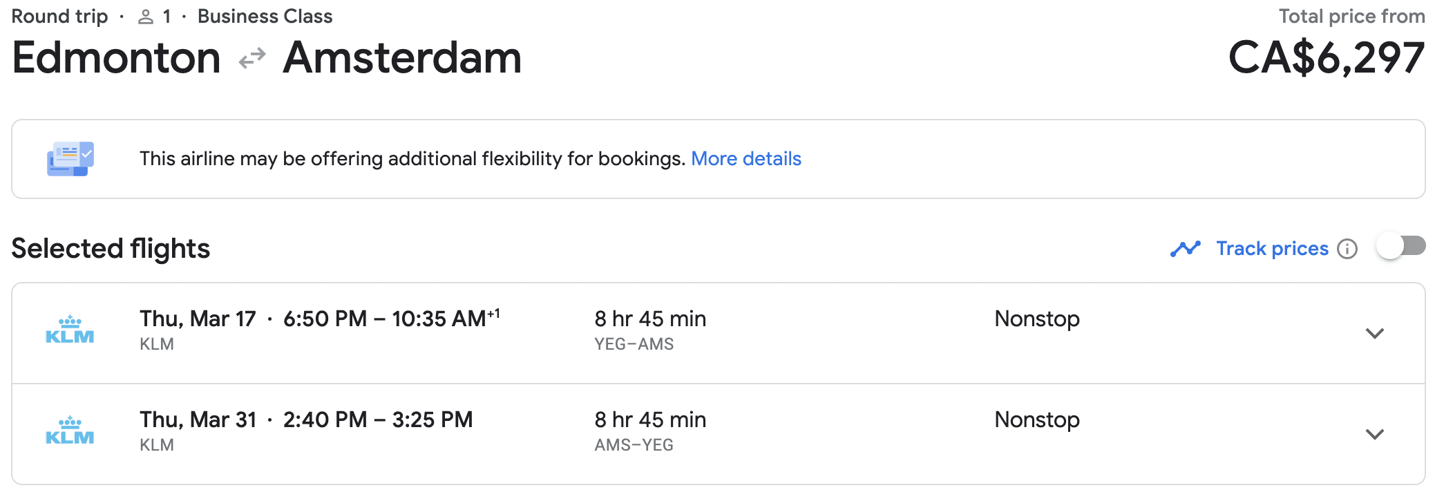 For example, KLM operates one of the only non-stop transatlantic flights out of Edmonton, and it’s priced starting at 60,000 Flying Blue miles for the one-way journey to Amsterdam in business class, or starting at 120,000 miles for a round-trip in business class.