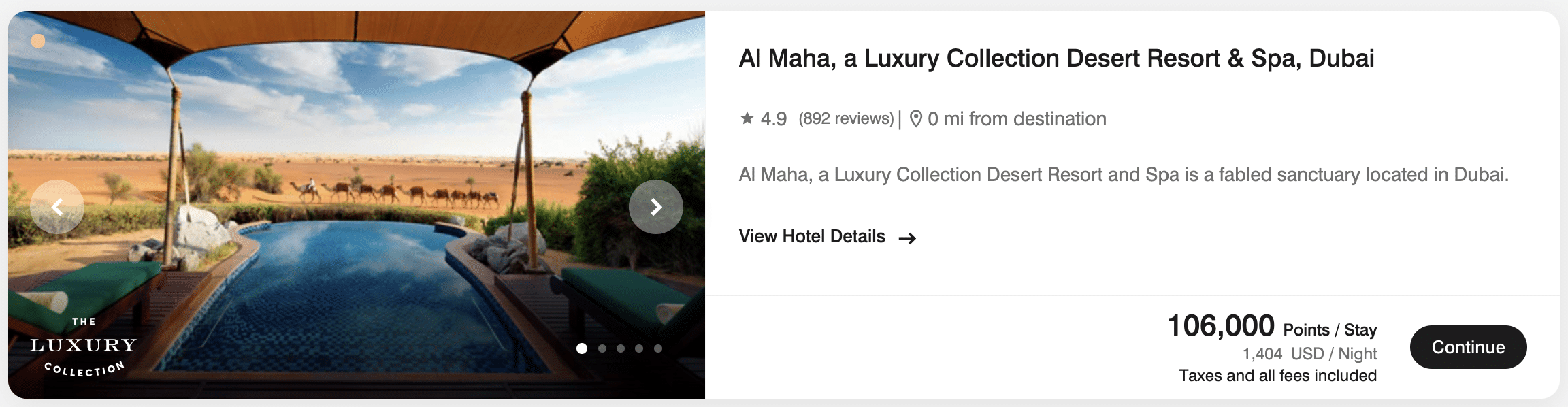 The best of the best go for 80,000–150,000+ points per night. Compare that to the cash price at the Luxury Collection’s Al Maha Desert Resort Dubai, which can easily exceed $1,400 (USD) per night.