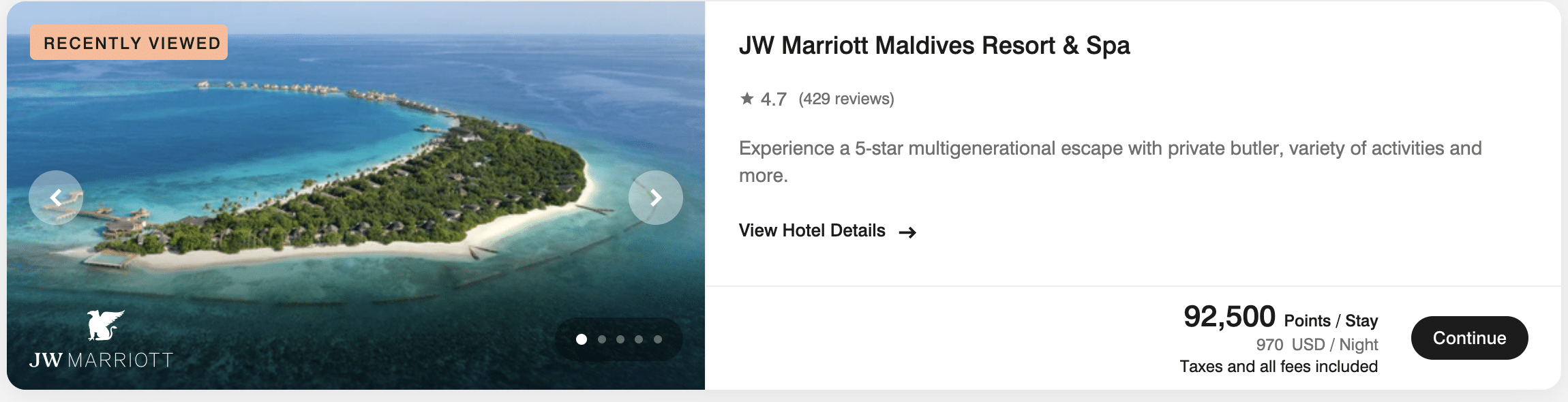 Or if the desert isn’t your style, you could indulge in decadence at the JW Marriott Maldives. Even with “relatively” more reasonable prices under $1,000 (USD) per night, a points booking is still the way to go.