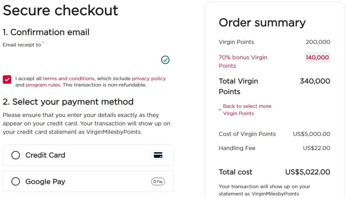 When buying or gifting Virgin Points, it’s recommended that you use a US-issued credit card for purchases in US dollars.