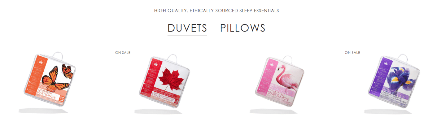 Most of their pillows and duvets are made locally in Ontario, which helps reduce transportation emissions and keeps production quality high.