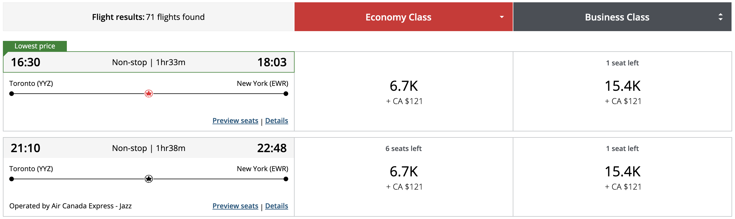For example, a one-way flight from Toronto (YYZ) to New York (EWR) in economy costs as few as 7,000 Aeroplan points, which is the same number of points you’d earn with a purchase of just $350 during this promotion (or more if you have Aeroplan Elite Status and/or pay with an Aeroplan credit card).