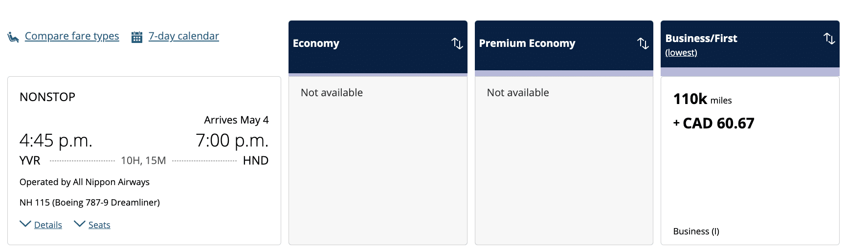 On the other hand, a one-way flight in ANA business class costs just 45,000 Virgin Points from Vancouver or the western US, or 47,500 Virgin Points from the eastern US. With the transfer bonus at play, you can effectively book the flights for just 35,000–37,000 Chase UR points.