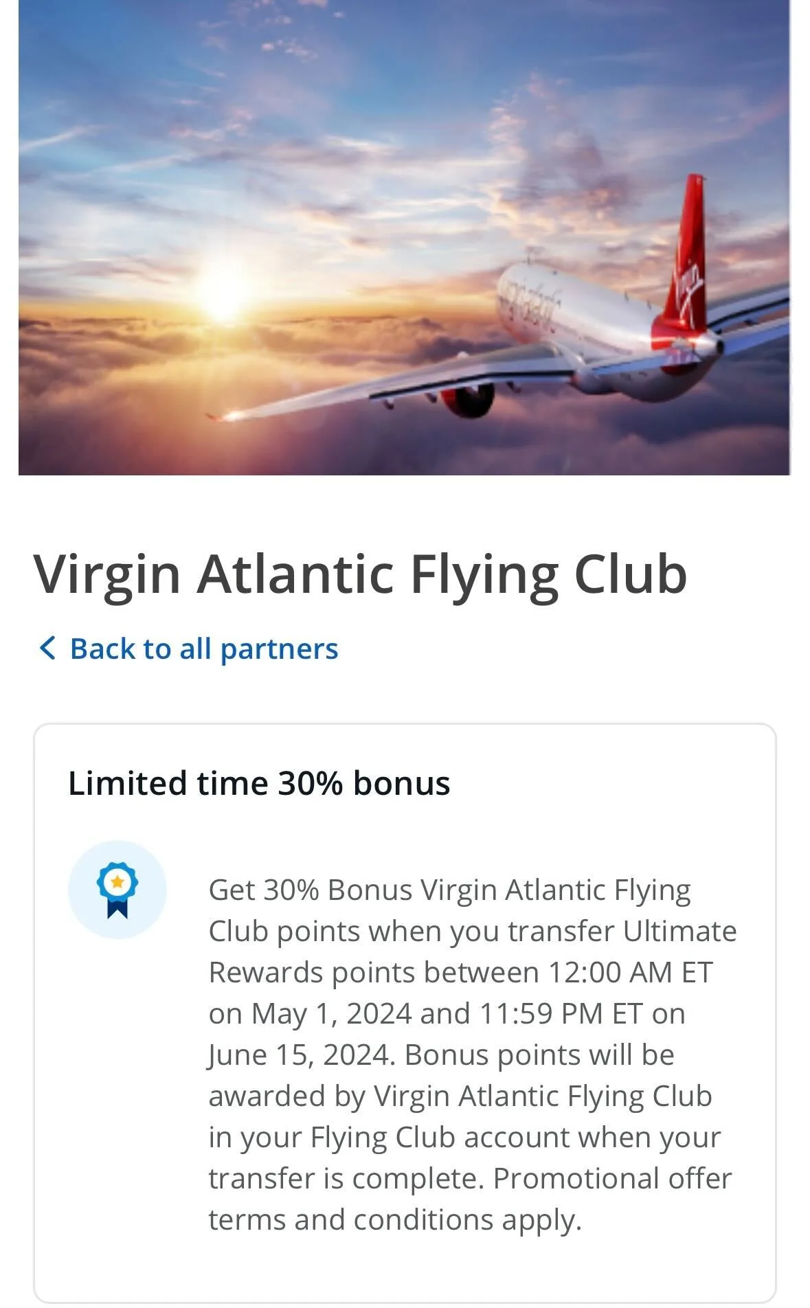 Chase is offering a 30% transfer bonus when you convert Chase Ultimate Rewards into Virgin Points in Virgin Atlantic Flying Club. This promotion runs until June 15, 2024, which leaves plenty of time to take advantage of it if you have a specific use in mind.