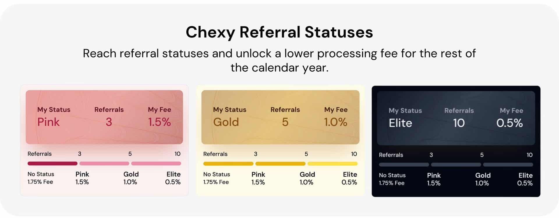 - 3 referrals = Pink Referrer Status → 1.5% processing fee