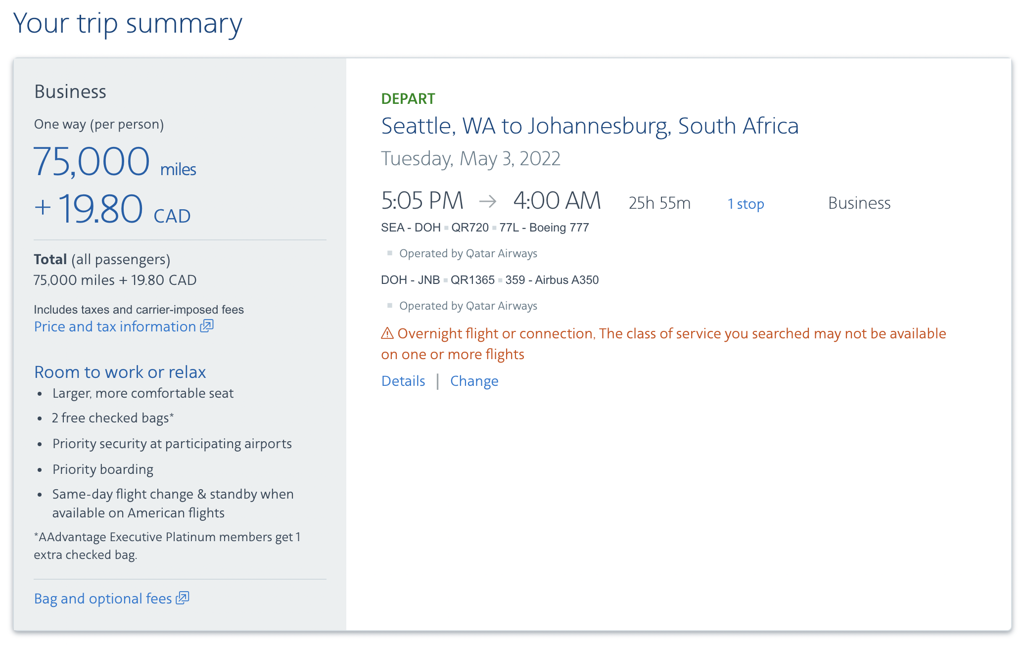 (Unfortunately, American’s strict routing rules mean that you can’t fly Qatar Airways from North America to Europe, Asia, or Australia on a single award. AAdvantage also doesn’t allow you to add stopovers on an award booking.)