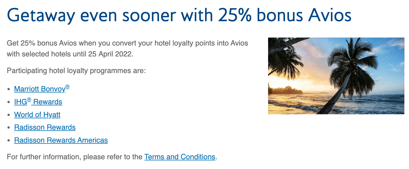 From today until April 25, 2022, Avios members will receive a 25% bonus when converting points from hotel loyalty programs. This is a fairly time-sensitive promotion, with under a week’s time to take advantage.