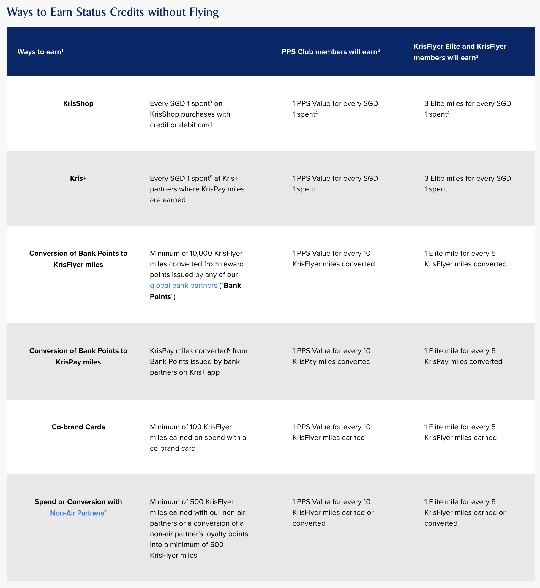 It’s the rows entitled “Conversion of Bank Points to KrisFlyer miles” and “Spend or Conversion with Non-Air Partners” that you should pay attention to: for every 5 KrisFlyer miles converted, you’d earn 1 Elite mile that counts towards your KrisFlyer Elite status.