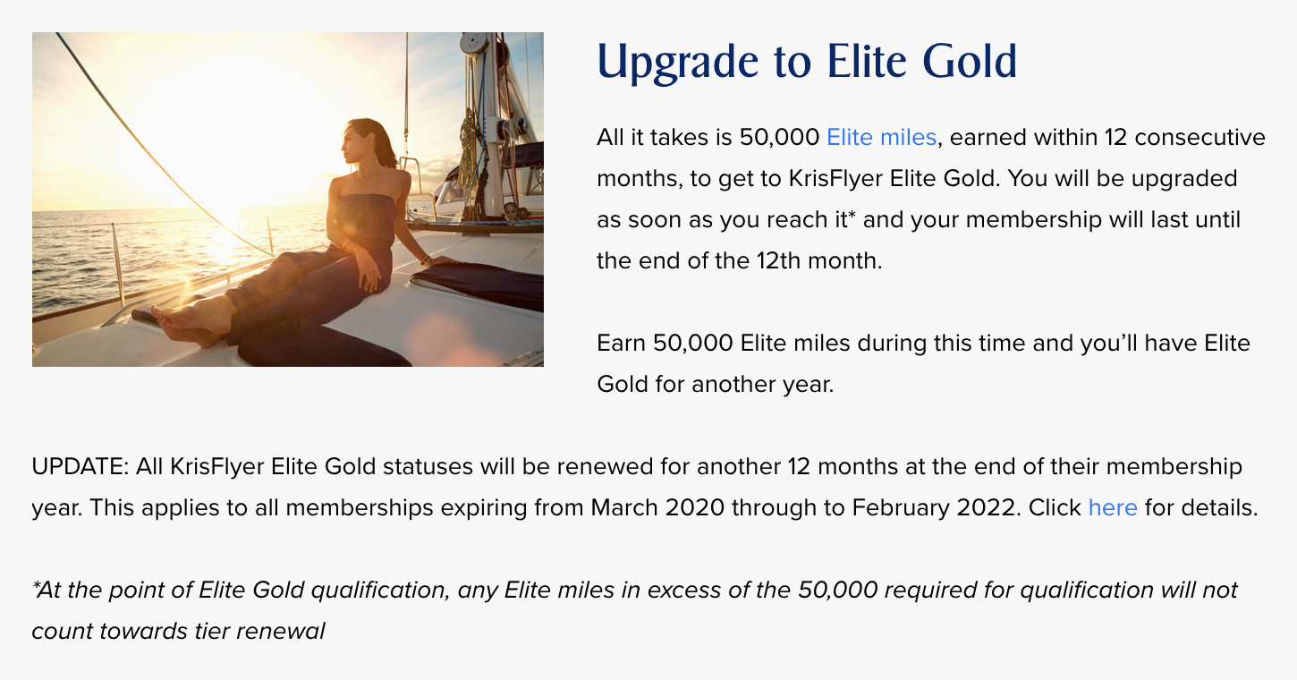 KrisFlyer Elite Gold normally requires earning 50,000 Elite miles within the KrisFlyer program to qualify for, upon which you’d earn the status for a 12-month period.