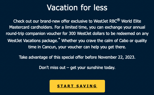 WestJet has launched a limited-time promotion for eligible cardholders of the WestJet RBC® Mastercard and the WestJet RBC® World Elite Mastercard. If you’ve been sent an email from WestJet, you can convert your available companion vouchers into 100–300 WestJet Dollars, which must be put towards a WestJet Vacations package.