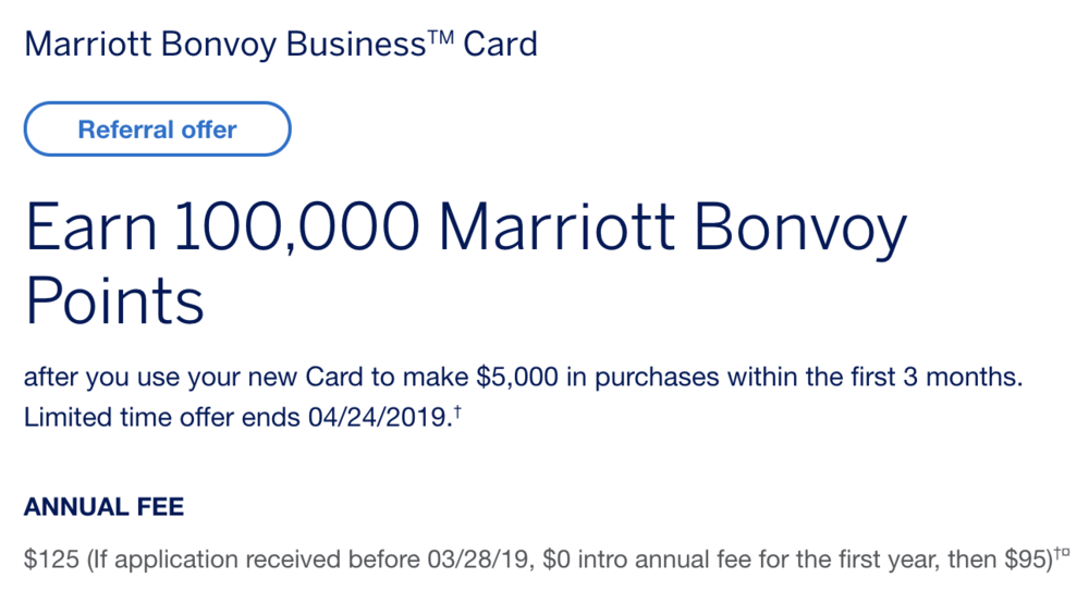 There’s one such offer at the moment that I would certainly be jumping on if I didn’t have the card already, so I figure it’s worth giving you a heads-up in case it’s applicable to your situation. I’m talking about the American Express US Marriott Bonvoy Business Card, which is offering 100,000 Marriott Bonvoy points after spending US$5,000 in the first three months. The signup bonus is valid until April 24, 2019, but the first-year annual fee waiver is only valid on applications received before March 28, 2019.