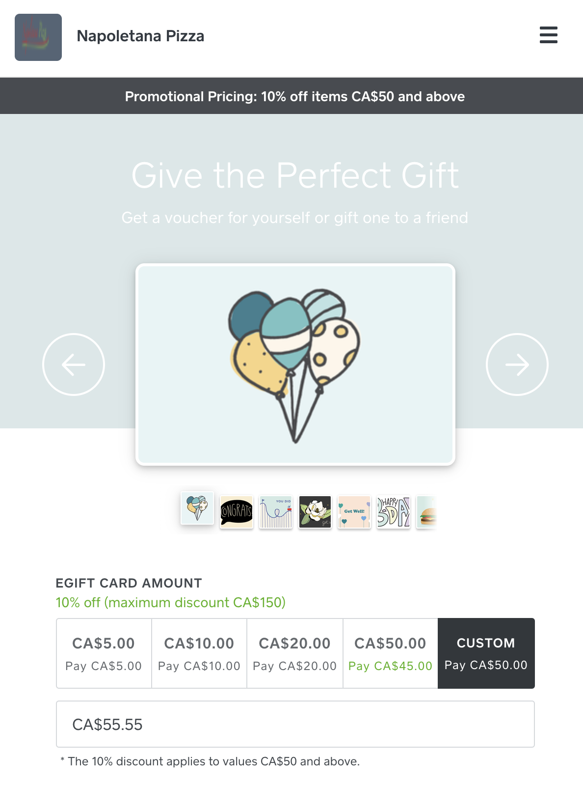 For example, Napoletana Pizza in Vancouver is offering a 10% discount on gift card purchases of $50 or more. However, that means that if I decided to get a $50 gift card, I’d only be charged $45, and wouldn’t be able to unlock the Amex Offer’s $20 statement credit with that purchase.
