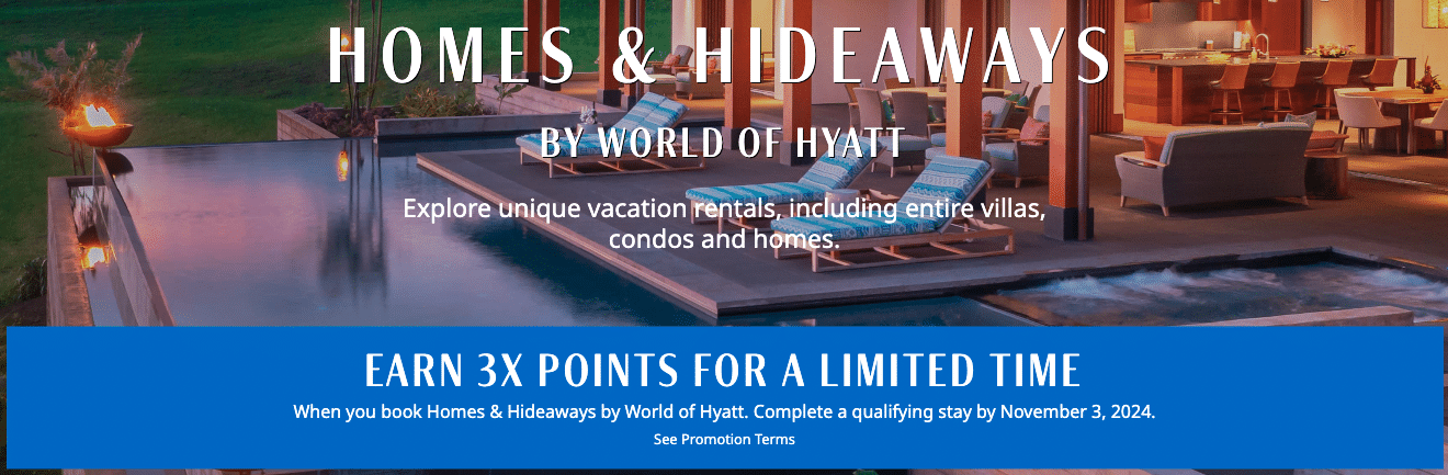 Homes & Hideaways by World of Hyatt has rolled out its latest promotion offering 3x World of Hyatt points on Homes and Hideaways vacation rentals, valid for stays that are booked and used between now and November 3, 2024.