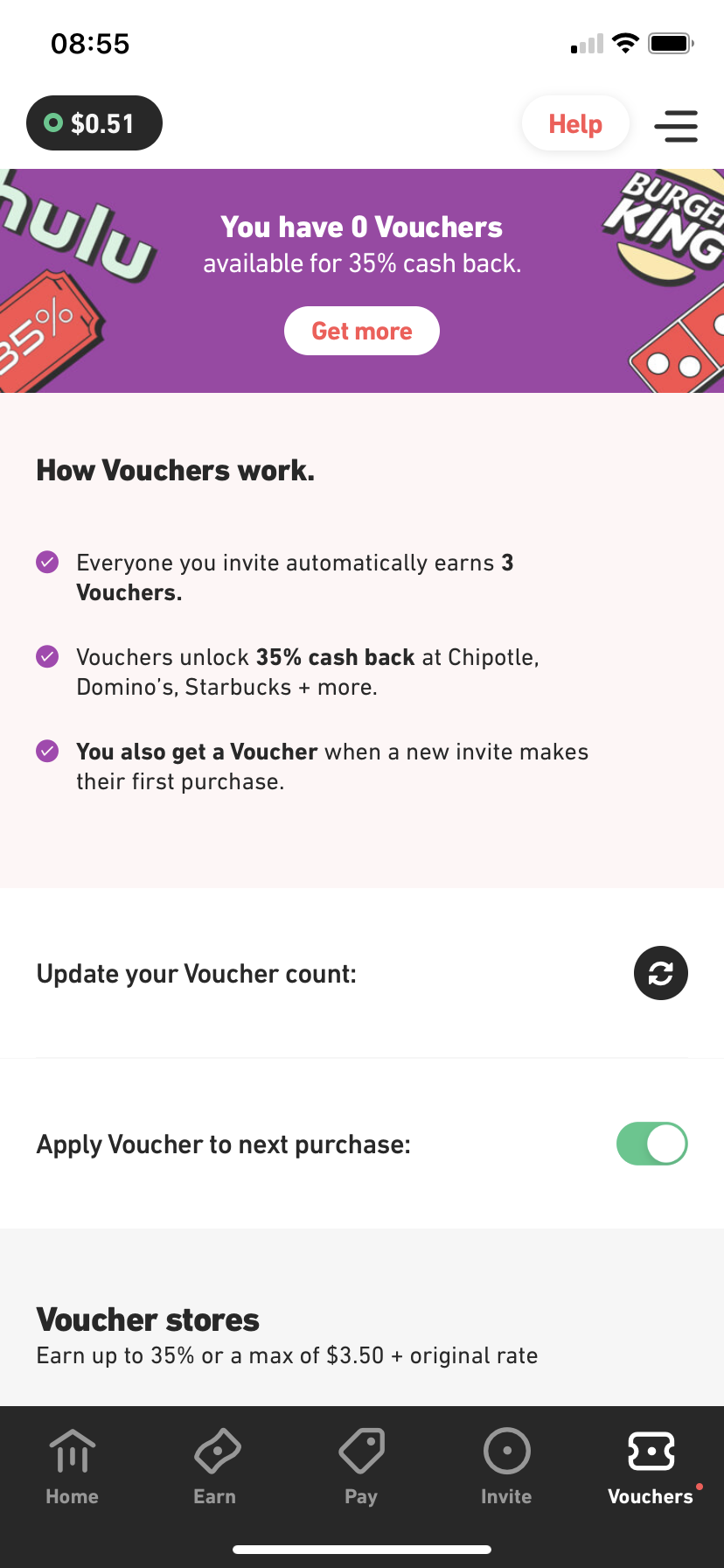 The Fluz app itself is more complicated than it needs to be, if you ask me. It uses a system of “Vouchers” that rewards you for making purchases by allowing you to earn up to 35% cash-back on any gift cards you buy in the form of Fluz credits. (Without a Voucher, the cash-back rate is much lower, between 0.5–2%.)