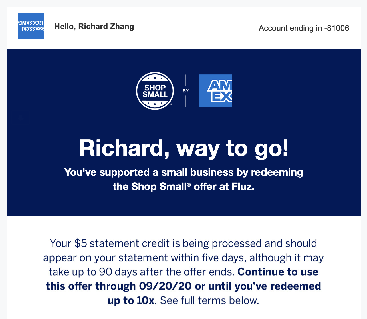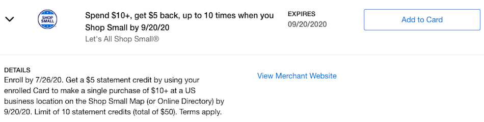 The Amex US Shop Small promotion is valid through September 20, 2020, and you can participate as long as you have a single Amex US credit card.