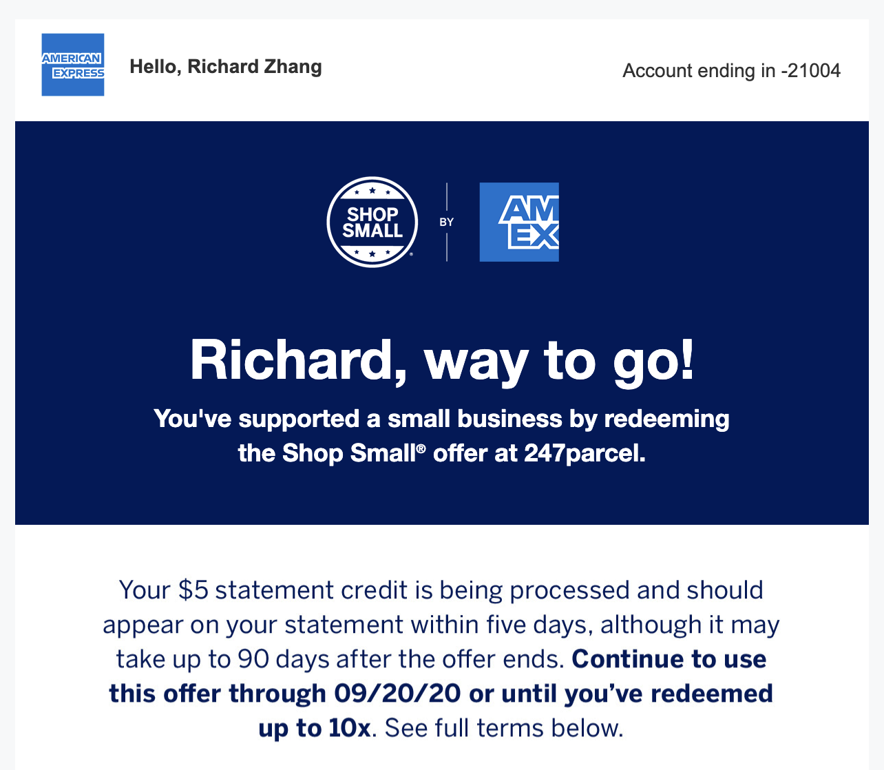 After every US$10 purchase you make, you’ll receive an email like this one from American Express US confirming that your Shop Small purchase has been made, and the US$5 credit triggered: