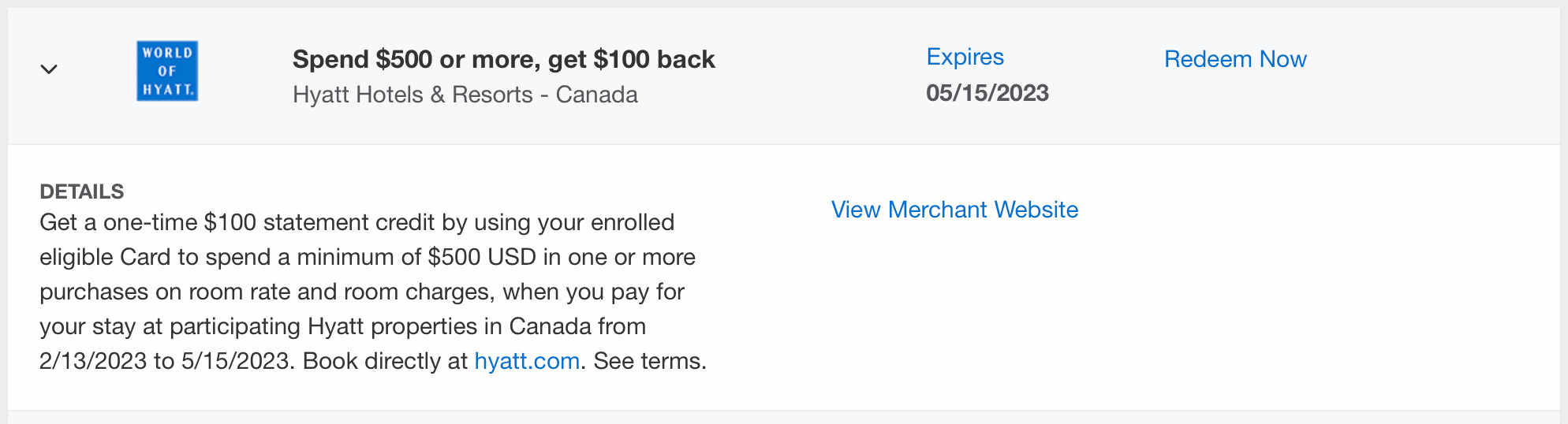 With this Amex Offer, you’ll earn a one-time $100 (USD) statement credit upon spending $500 (USD) after taxes at participating Hyatt hotels. The promotion is limited to Canadian properties, and your stay must be booked directly with Hyatt in order to qualify.