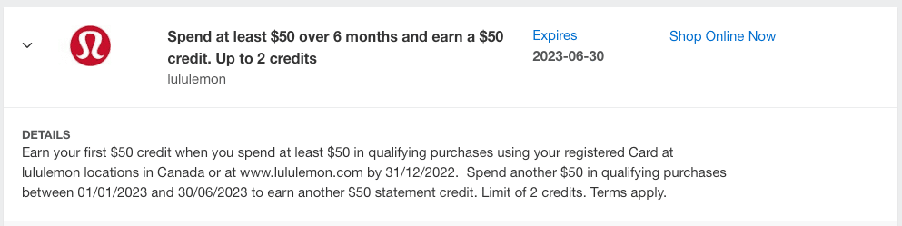 From now until June 30, 2023, American Express Platinum Card members may register their card and then earn a $50 statement credit upon spending $50 with Lululemon, up to two times in total, for a total of up to $100 in statement credits.