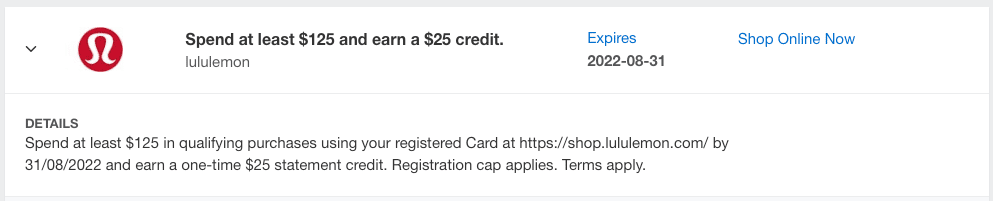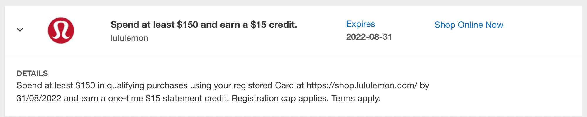 This represents the least rewarding version of the Lululemon Amex Offers, but is nonetheless a good way to recoup some costs if you’re shopping there anyway.