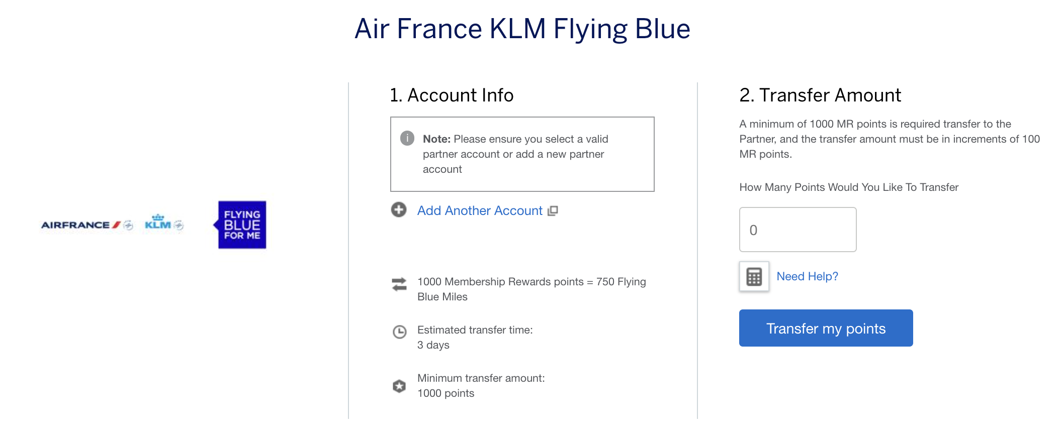 Flying Blue has already been added to the online transfer portal, and you can go ahead and convert your points. You’ll need to link your Flying Blue account to your MR account, and the transfer process is estimated to take three days to complete.