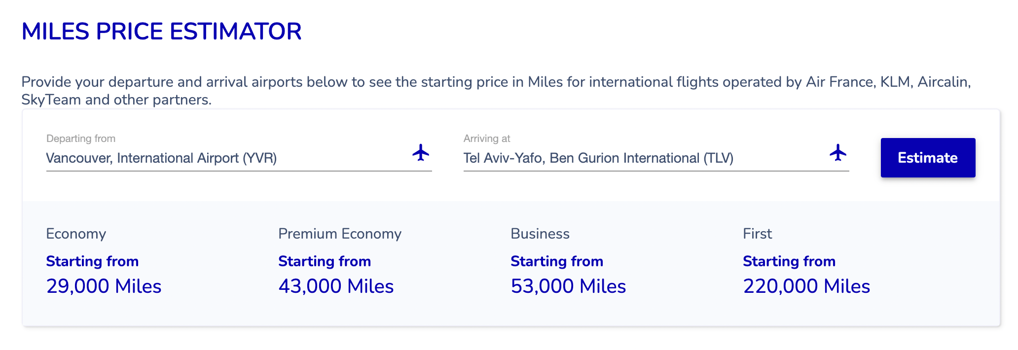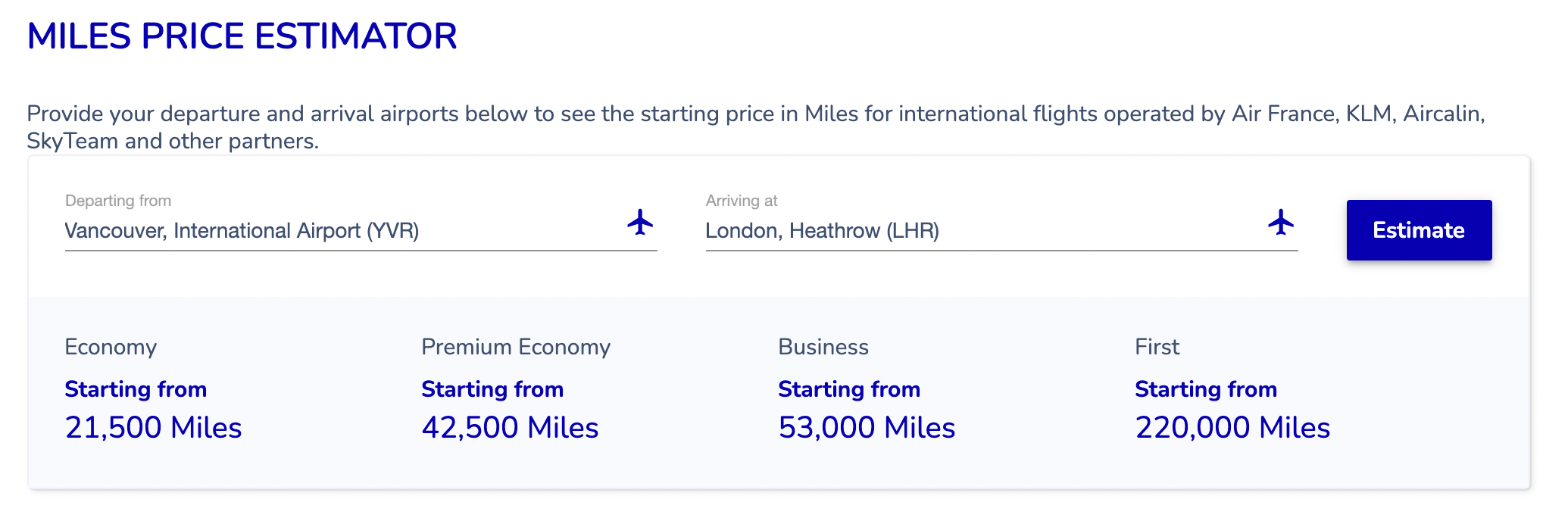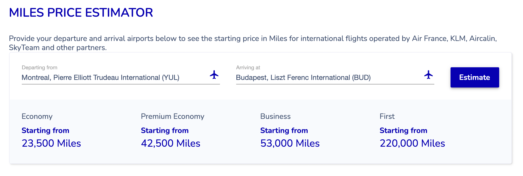 Flying Blue uses dynamic award pricing without a published chart, but instead offers a Miles Estimator to give users a sense of the base pricing for any given route.