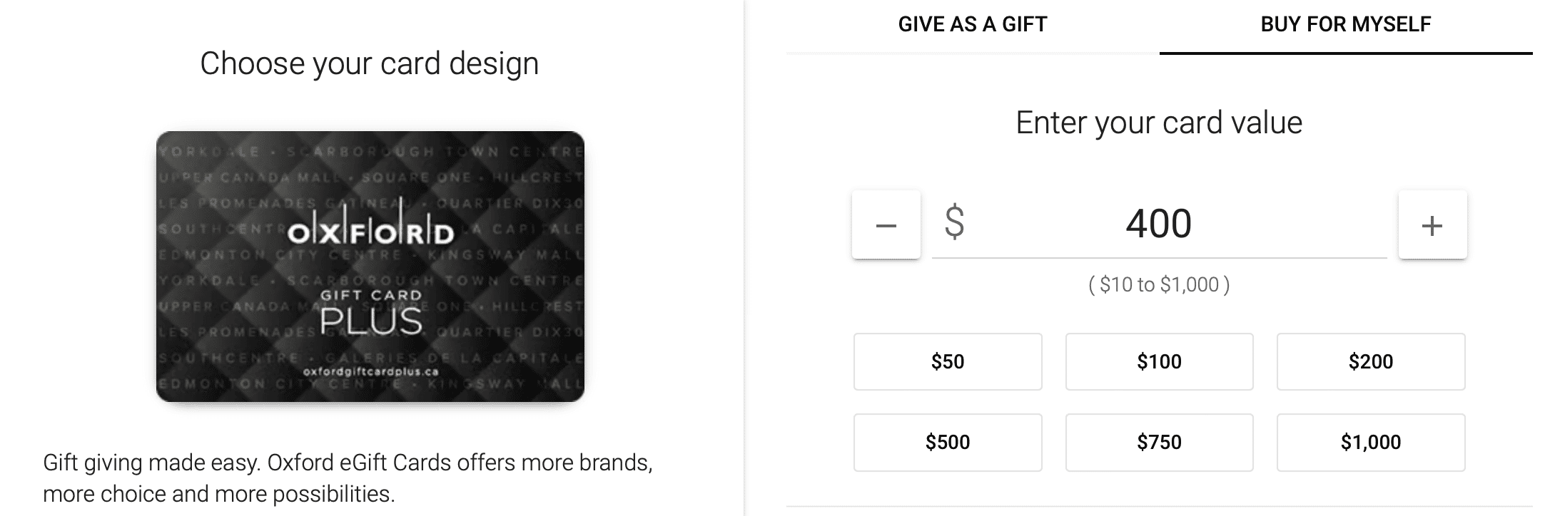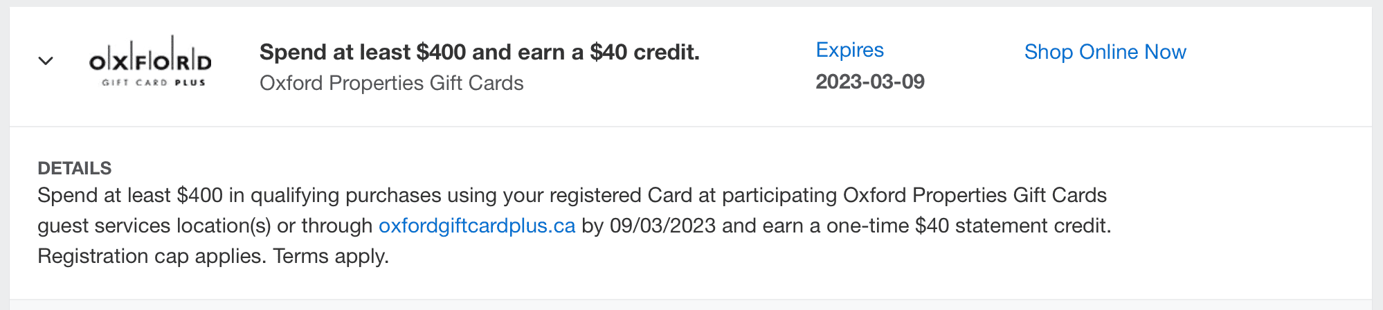 With this Amex Offer, eligible cardholders can earn a $40 (CAD) statement credit upon spending a minimum of $400 (CAD) on gift card purchases at Oxford Properties in Canada or online through oxfordgiftcardplus.ca.