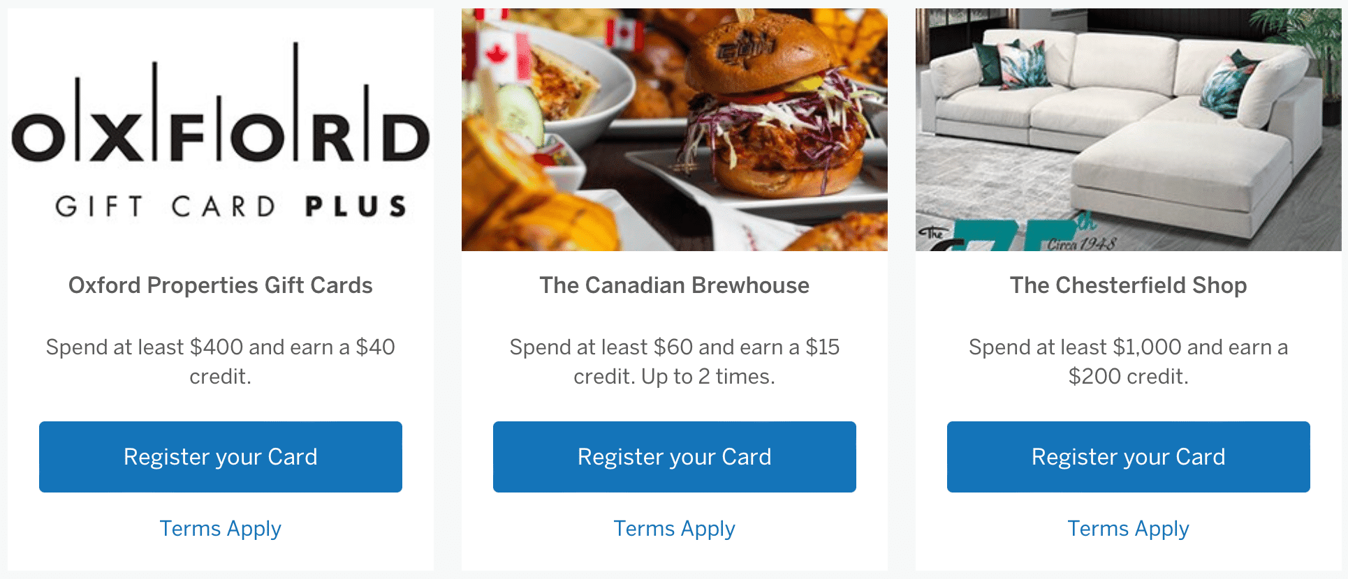 You’ll earn a $40 (CAD) statement credit when you spend $400+ (CAD) on Oxford Properties gift cards, whether purchased at an Oxford Properties guest service location or online.